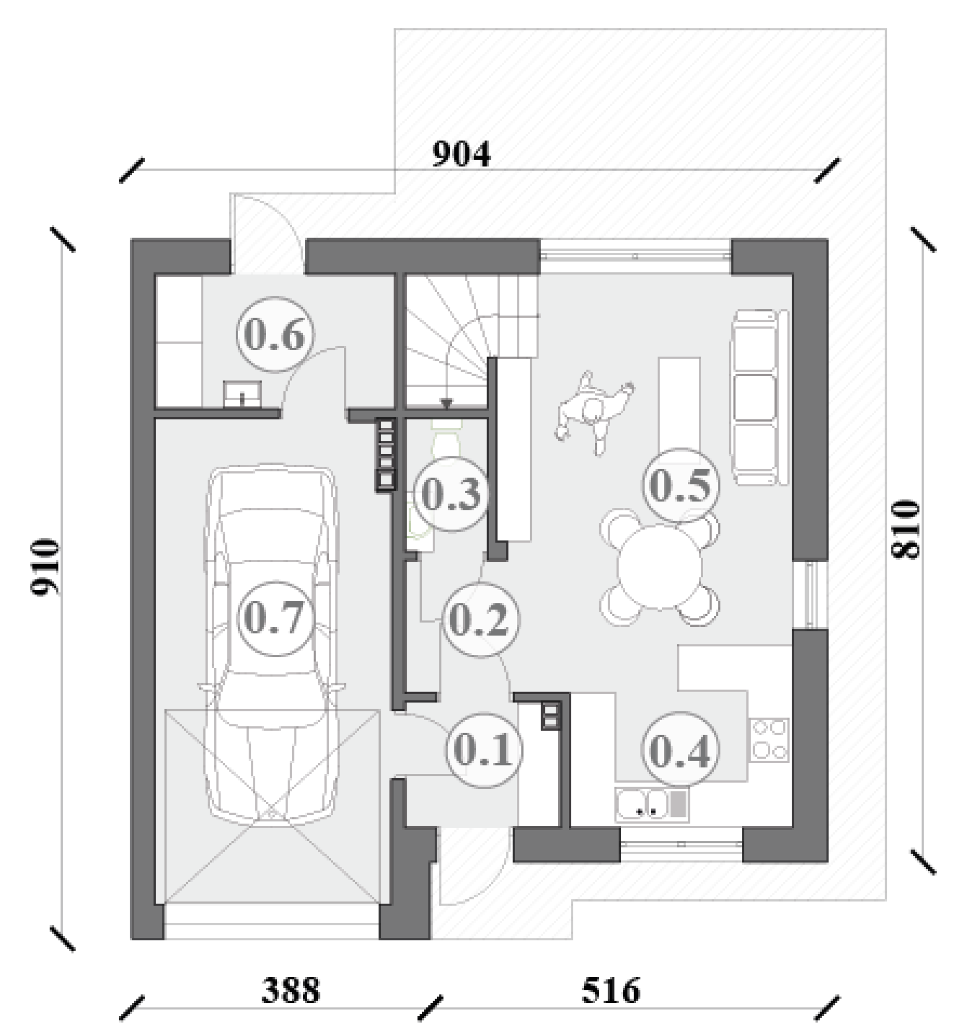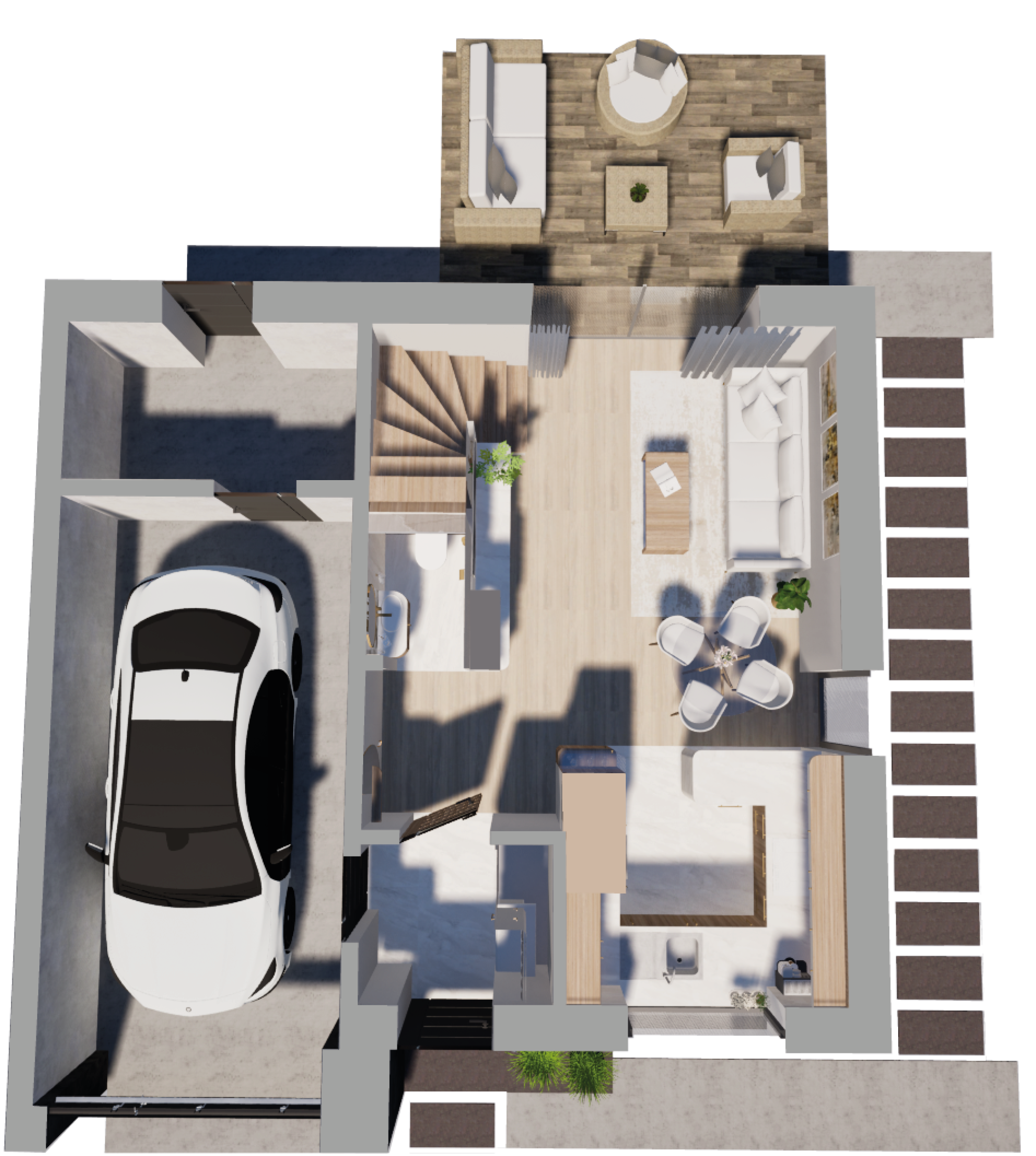 Parter posiada funkcjonalny układ pomieszczeń obejmujący : przedpokój, przestronny salon z kuchnią, toaletę, garaż, pomieszczenie techniczne oraz bezpośrednie wyjście na taras i ogród - idealne miejsce do wypoczynku.