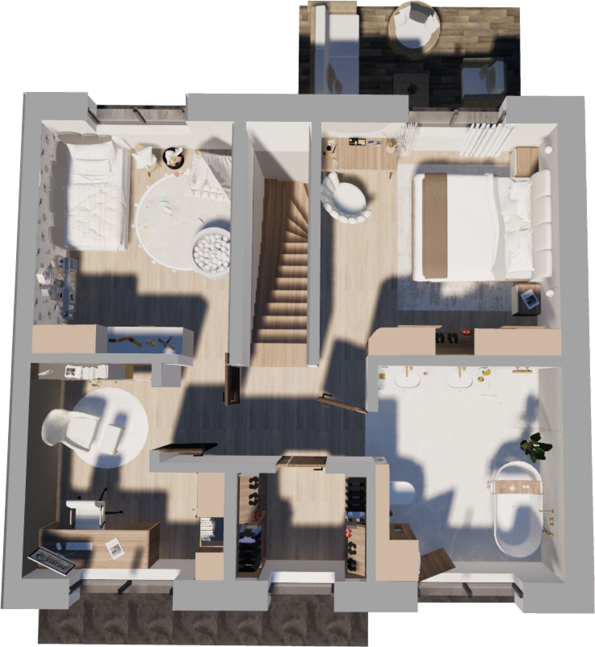 Piętro oferuje trzy komfortowe sypialnie, garderobę oraz dużą łazienkę, zapewniającą domownikom prywatność i wygodę na co dzień.