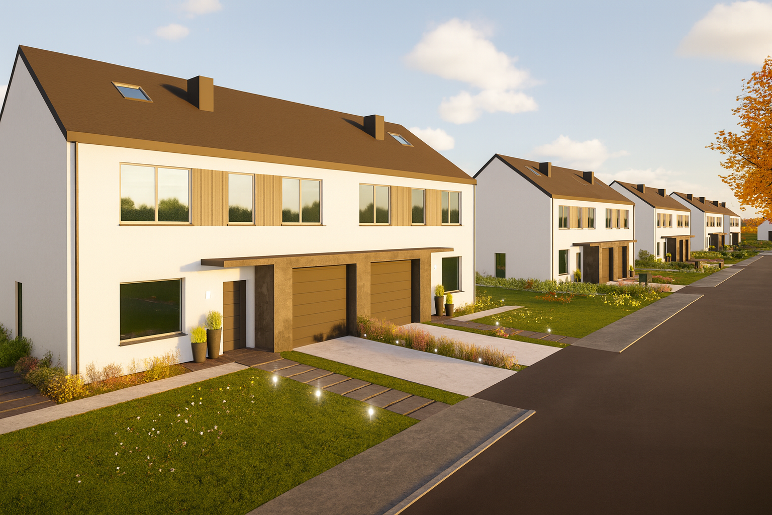 Domy w zabudowie bliźniaczej tworzą przyjazne, nowoczesne osiedle, zaprojektowane z myślą o komforcie i jakości życia. To propozycja dla tych, którzy szukają harmonii między miejskim stylem życia a spokojem natury.